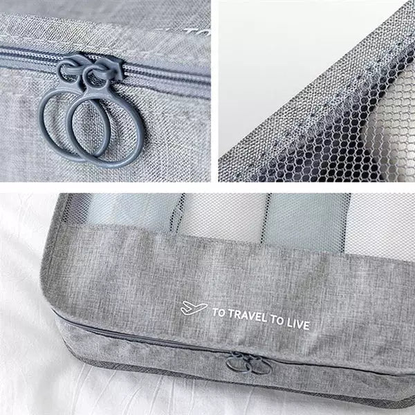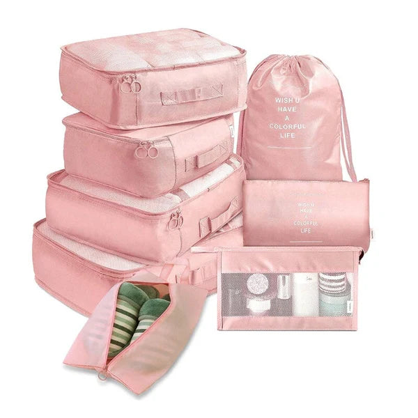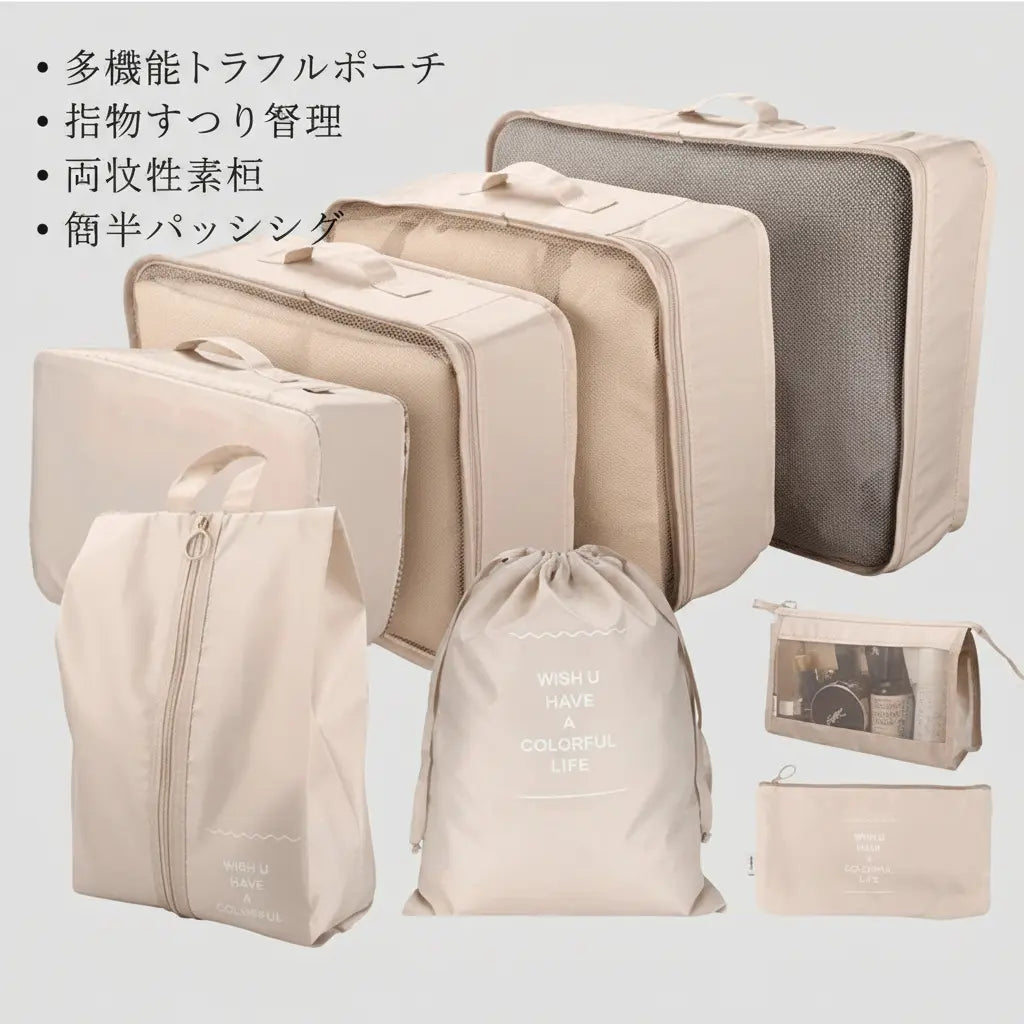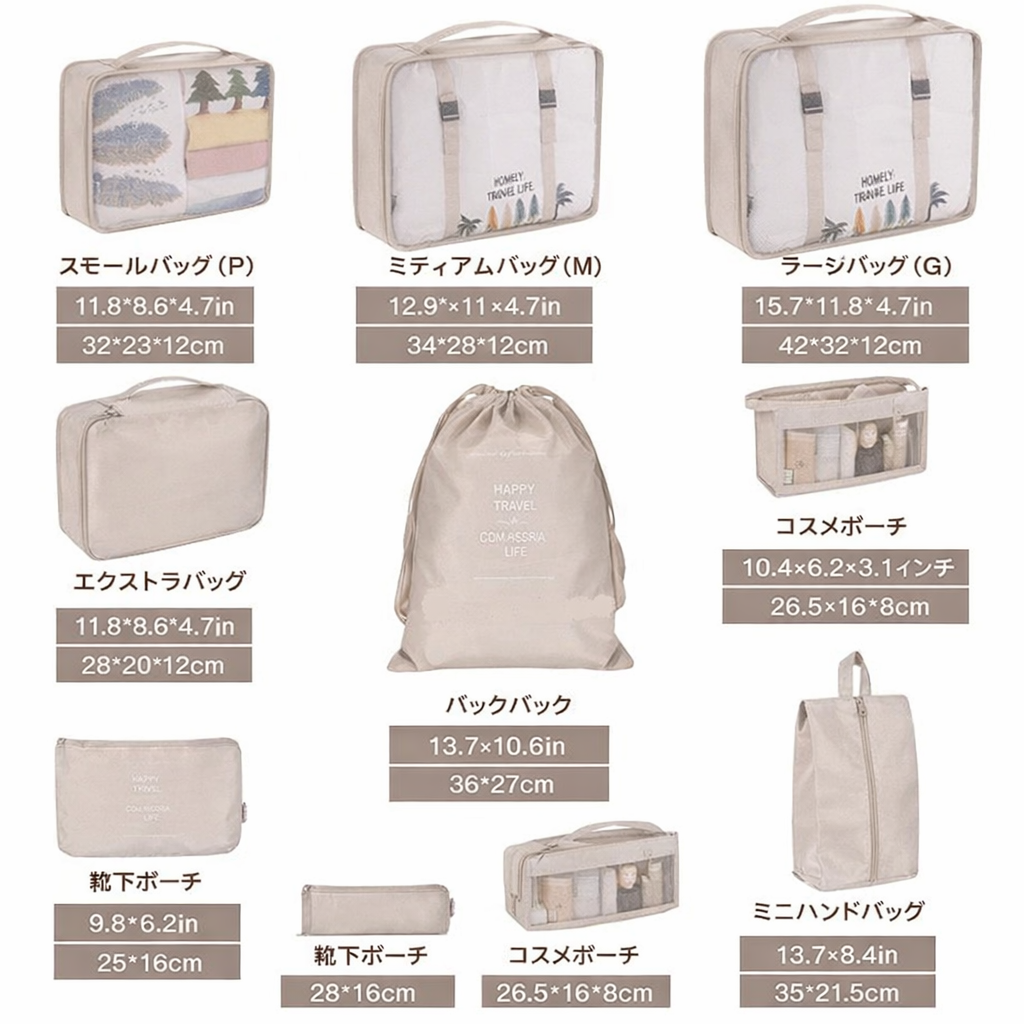 はい。用途に合わせて設計された複数サイズのポーチがセットになっており、アウター類、Tシャツ、下着、靴、小物類まで整理して収納できます。スーツケース内のスペースをより効率的に活用でき、全体をすっきりと整えることが可能です。